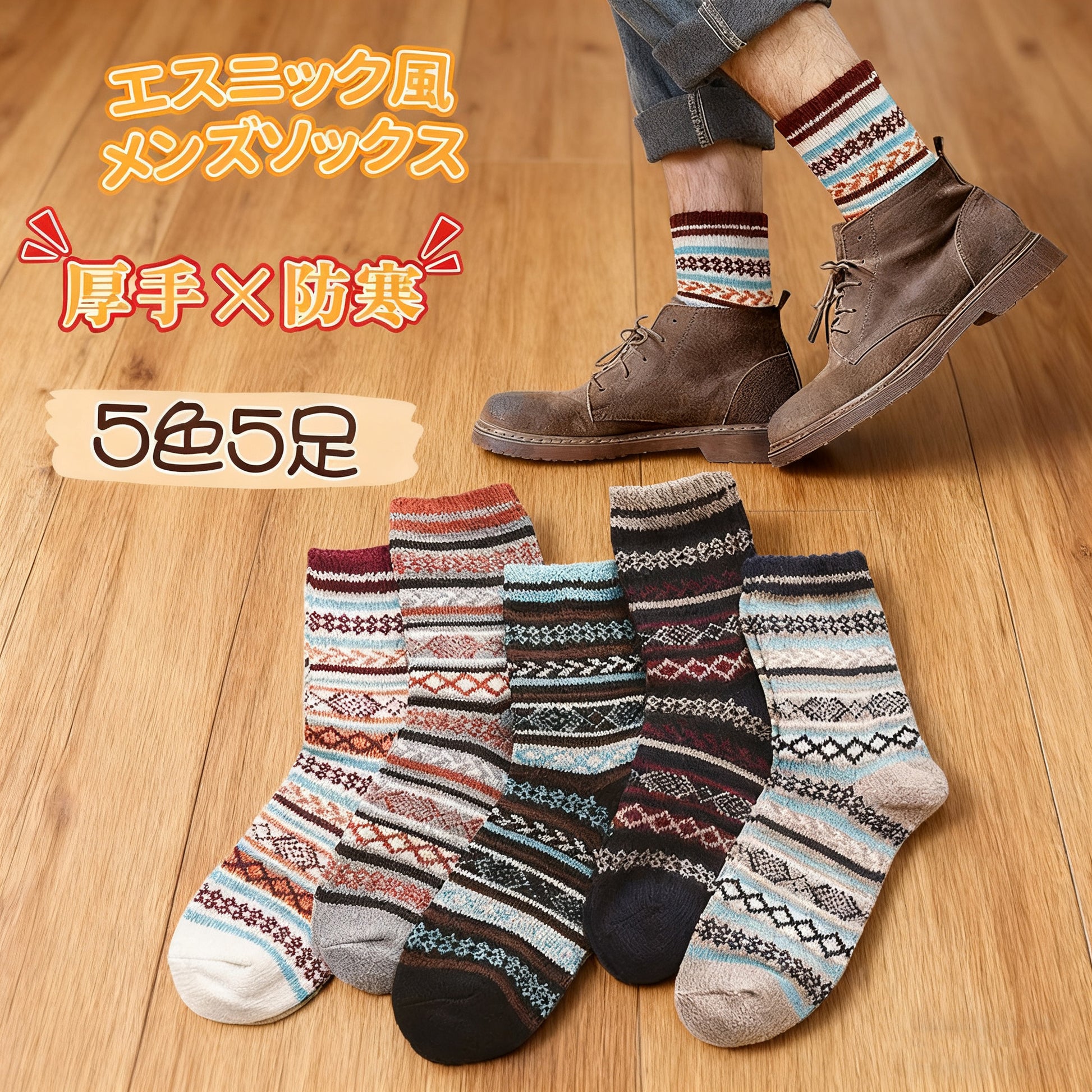 靴下 メンズ 冬用 防寒 クルーソックス 厚手 綿 ウール 24-27cm 5足セット 冷え対策 吸汗 保温 ビジネス アウトドア ギフト対応 男性用 くつした 暖かい 5色 くつ下 秋冬